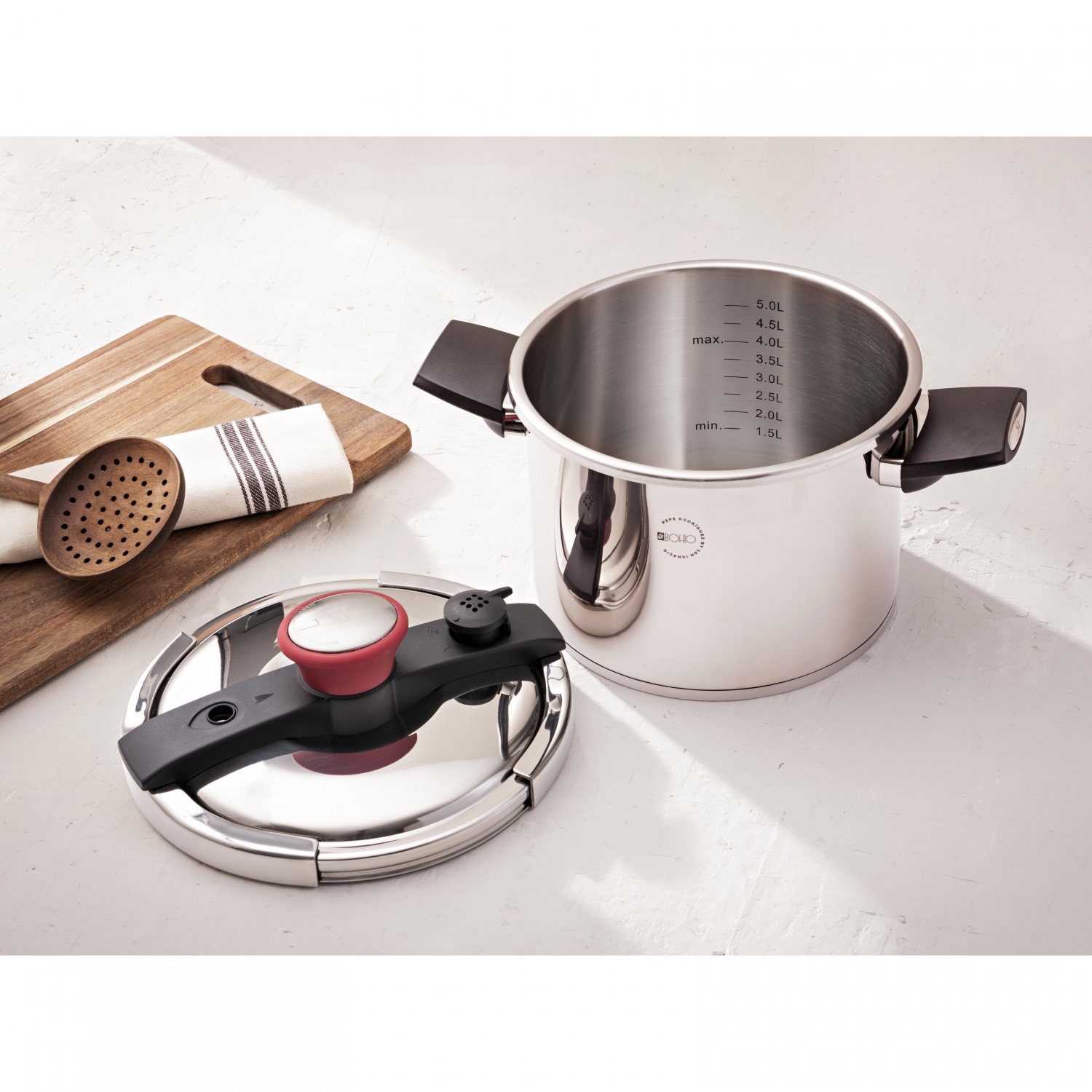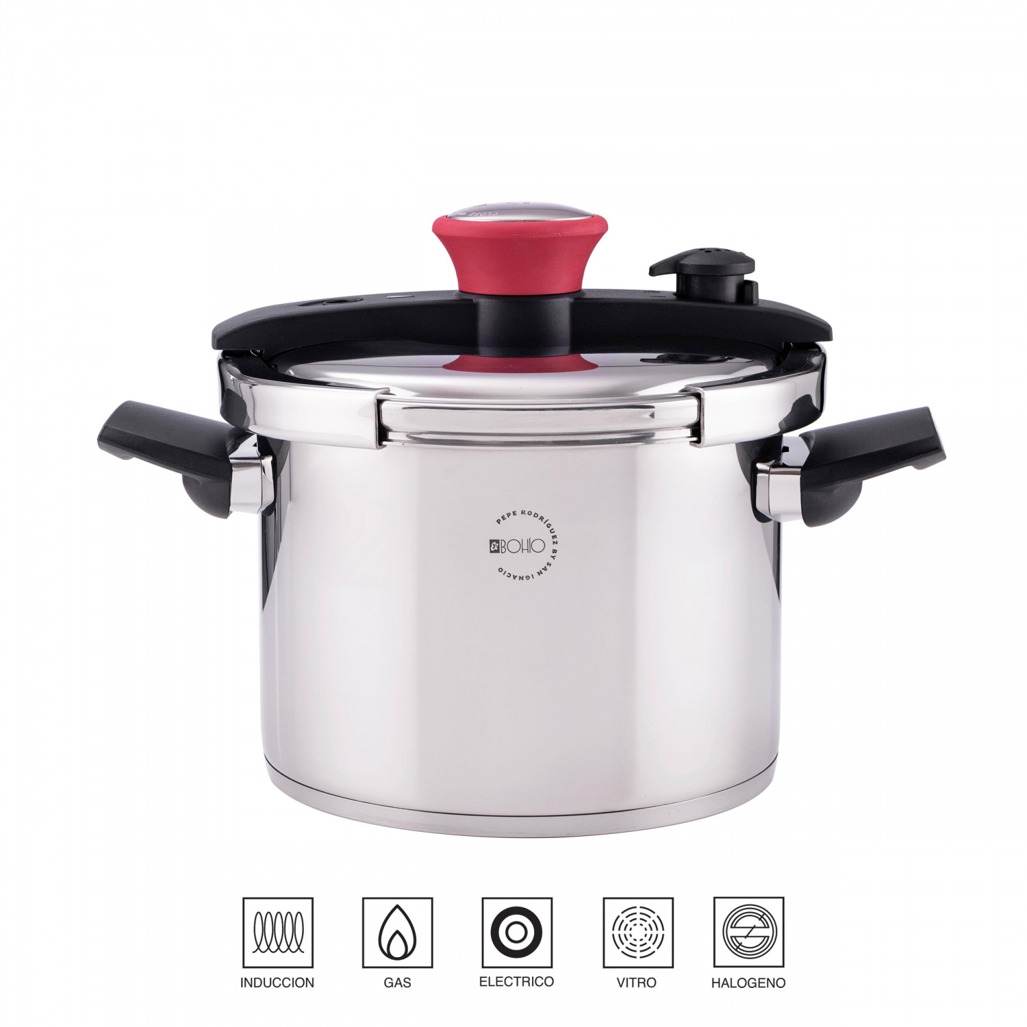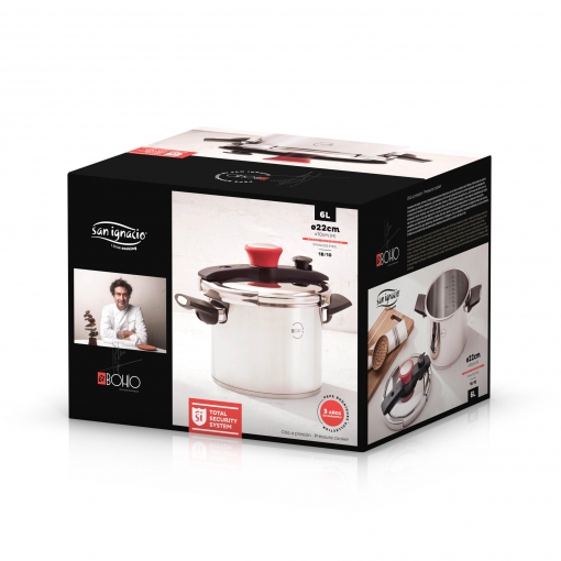 “El Bohío by Pepe Rodríguez, robots y utensilios de cocina profesionales de alto rendimiento en tu casa. Conserva el sabor, aroma y propiedades de los alimentos con la olla a presión de El Bohío, fabricada en acero inoxidable de máxima resistencia y durabilidad y 6 litros de capacidad para cocinar grandes cantidades de comida para familias o para comer varios días. Posee un fácil sistema de apertura y cierre que se abre con un simple giro de la muñeca, una válvula de seguridad y de liberación de presión y asas negras resistentes al calor, así como un pomo rojo que alegrará tu cocina. Su fondo de aluminio encapsulado en su base de inducción posibilita una distribución eficiente y rápida del calor para un cocinado uniforme en cualquier placa de cocina, ya sea de inducción, gas, eléctrica, vitrocerámica o halógena. Con un diseño y acabado brillante, la olla a presión El Bohío se convertirá en la alternativa rápida y sana para la cocina del día a día.