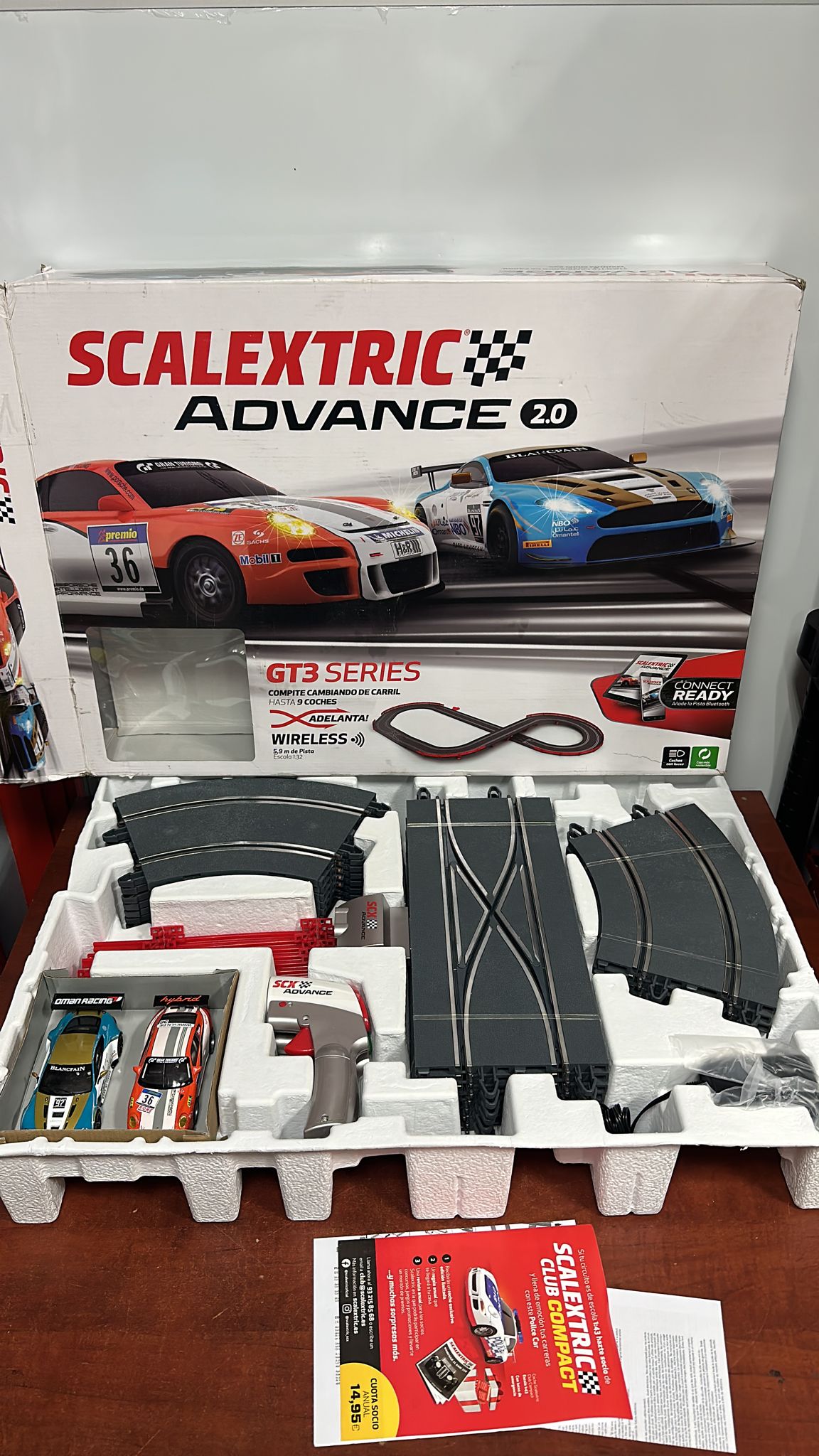 Scalextric ADVANCE GT3 Series: La experiencia más avanzada y completa de Scalextric con conexión Smartphone y Tablet. Un circuito de carreras de 5,9 metros de pista con 12 curvas y mandos inalámbricos. Dos coches incluidos: La experiencia con dos coches de carreras slot GT: Porsche 911 GT3 – Hybrid y Vantage GT3 – St.Gallen. Monta el circuito y disfruta desde el primer día. Circuito escala 1:32 de carreras de coches: 12 curvas, 2 cambios de rail